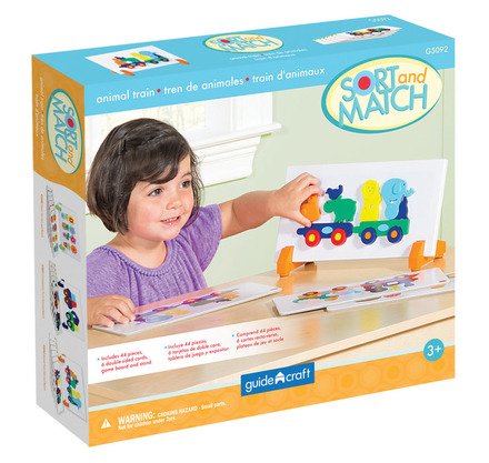 Animal Train Sort and Match is the perfect way to teach color-matching, shape-matching and pattern-recognition in a fun, game-like setting. Animal Train Sort and Match includes six double-sided pattern cards, 43 animal and train pieces, and a self-propping board and stand with pegs and metal backing to help guide the magnetic pieces into place. Ages 3+.6 double-sided pattern cards, magnetic pieces, embedded magnets, box for storage