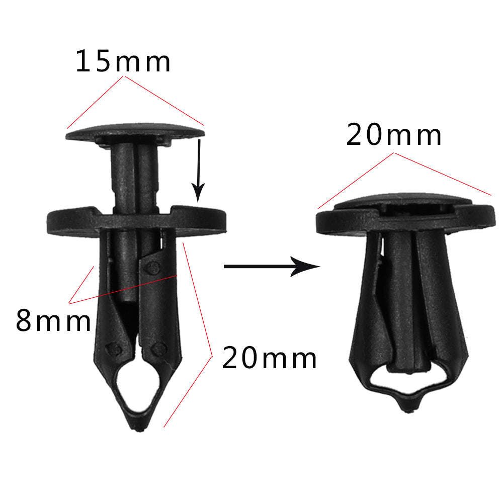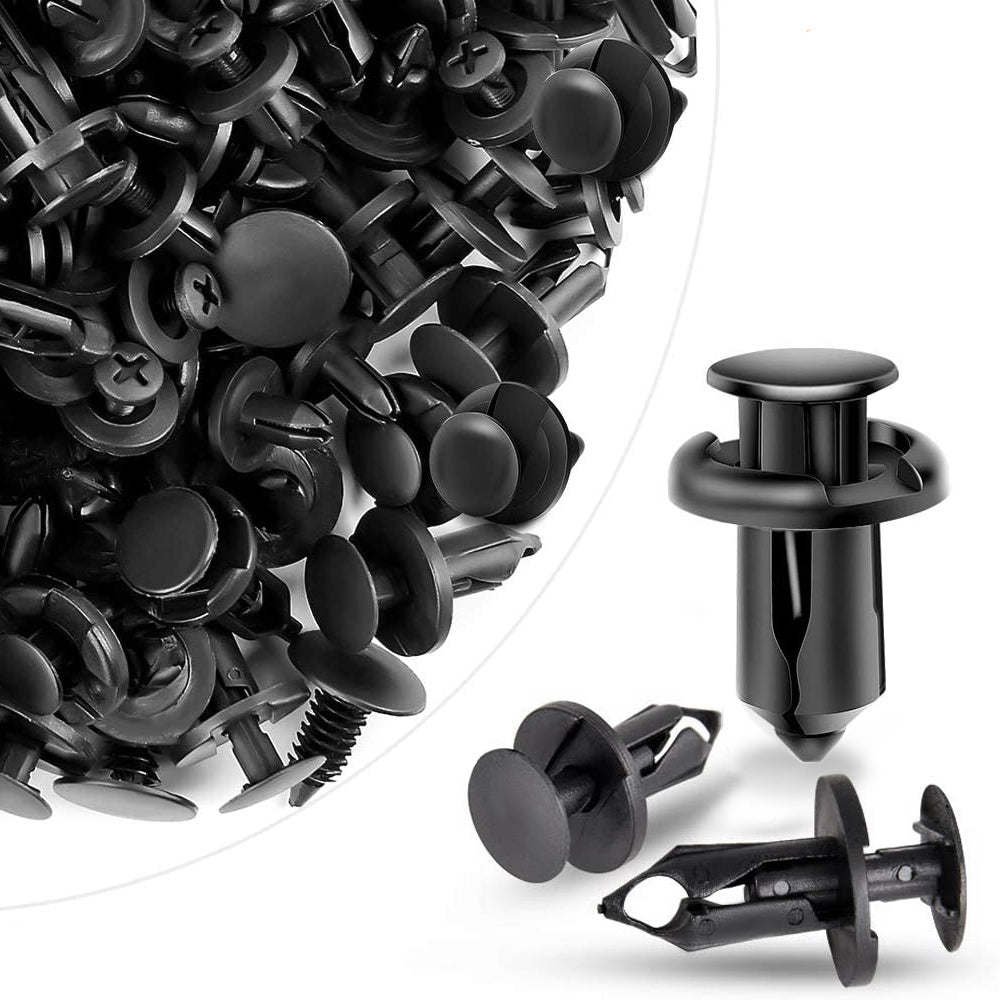 These universal plastic clips will fit most auto parts with an 8mm hole; please check the replace hole size before placing an order.The push pins will be used for holding on radiator yoke, fender, fender flare, bumper, splash shield, retainer, mud flap, grille, etc.Very easy to install and remove easier with a rivet remove tool ( tool not included).The sturdy black nylon material will hold up the fender, bumper, splash shield, splash guard, retainer tight and well.The package includes 100 pieces of fasteners which will be enough for you to use.They can be used on motorcycles, buses, cars, trains, planes, trucks, etc.Specification: Color: BlackMaterial: PlasticTotal Length: 25mm/0.98"Stem Length: 20mm/0.78"Fit Hole Diameter: 8mm /0.31"Applications: Fender Body Door Trim Panel Hood
