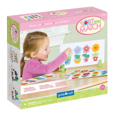 Flower Pot Sort and Match is the perfect way to teach color-matching, shape-matching and pattern-recognition in a fun, game-like setting. Flower Pot Sort and Match includes six double-sided pattern cards, 44 flower pieces, and a self-propping board and stand with pegs and metal backing to help guide the magnetic pieces into place. Ages 3+.6 double-sided pattern cards, magnetic pieces, embedded magnets, box for storage